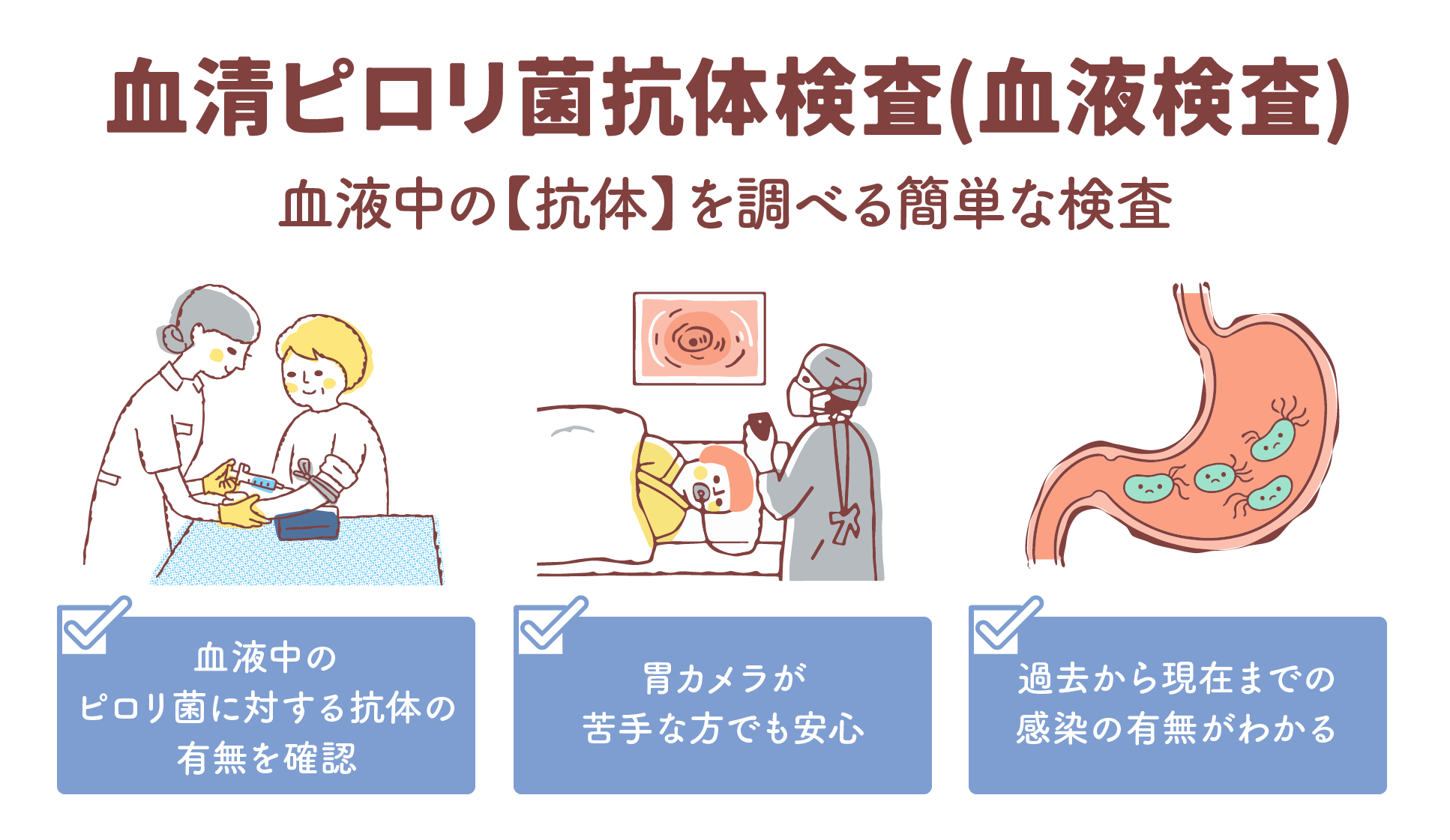 当院では、採血だけで行える血液検査(血清ピロリ菌抗体検査)を行っています。血液中のピロリ菌に対する抗体の有無を確認する方法で、胃カメラに抵抗がある方でも受けていただきやすい検査です。