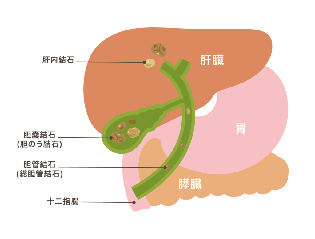 胆石はそのできる場所によっても呼び名が異なり、胆のうにできたものを胆のう結石、胆管にできたものを胆管結石(肝内胆管か総胆管かでさらに分類)と呼びます。