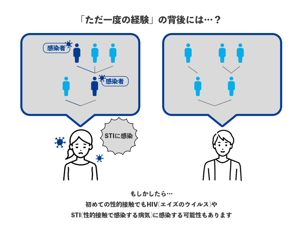 ところが、どちらかが1度でも過去に性行為の経験があり性感染症に感染していた場合、1回きりの性行為でも感染する場合があります。